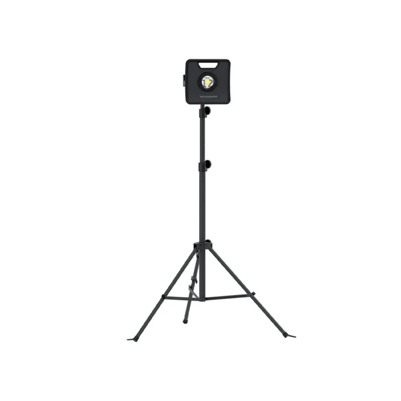 Стійкий штатив Scangrip Tripod із міцної сталі, покритої порошковою фарбою, дозволяє регулювати висоту прожектора в межах 1.35...3 м, а також змінювати його кут нахилу для забезпечення оптимальних умов освітлення. Конструкція штатива забезпечує безпечне встановлення навіть при висуванні центральної штанги на максимальну довжину. Для підвищення безпеки під час роботи, кабель прожектора можна зафіксувати на будь-якій ніжці штатива за допомогою запобіжного зажиму.