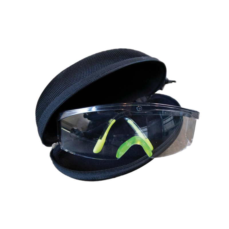 Захисні окуляри виконані із оптично прозорого плексигласу. Регульована довжина дужок дозволяє індивідуально адаптувати окуляри під конкретного користувача. У комплекті – жорсткий кейс для зберігання та транспортування з карабіном для кріплення на пояс.