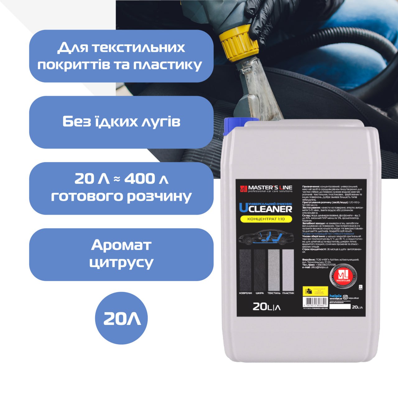 Призначення: концентрат; універсальний засіб із середнім рівнем піноутворення призначений для приготування розчину для чищення текстильних покриттів, пластику та інших стійких до мокрого слаболужного оброблення поверхонь. Засіб делікатний до гуми, металів, усіх видів емалей та багатьох інших фарб. Добре підходить для видалення переважної більшості типових для внутрішнього оздоблення авто забруднень, зокрема пилу, потожирових нашарувань, плям від напоїв (крім випадків фарбування волокна барвником у складі напою), масляних поверхневих плівок, смол і конденсатів, які виникають унаслідок куріння в салоні.