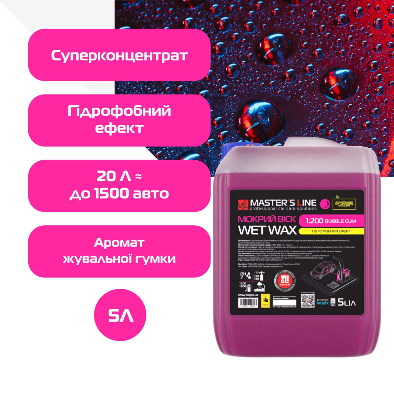 Віск для сушки Masters Line «Bubble gum» 1:200 призначений для прискорення сушки автомобіля після мийки. Висококонцентрований засіб з консервуючими властивостями і захистом від ультрафіолету. Може використовуватися зі всіма типами обладнання, з жорсткою і м’якою, холодною і гарячою водою.