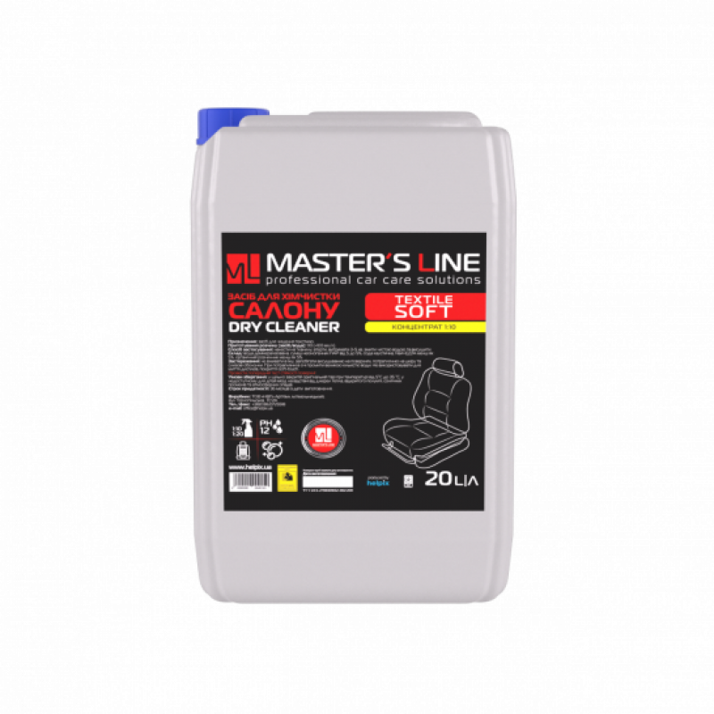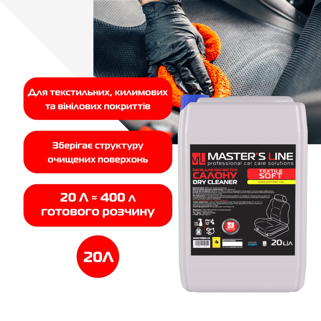 Засіб для хімчистки салону Master’s Line Textile cleaner Soft концентрат 1:10 – призначений для ефективного очищення та відновлення текстильних, килимових та вінілових покриттів. Може використовуватись як для хімчистки салону авто, так і в побуті для очистки м’яких меблів з текстильною оббивкою.