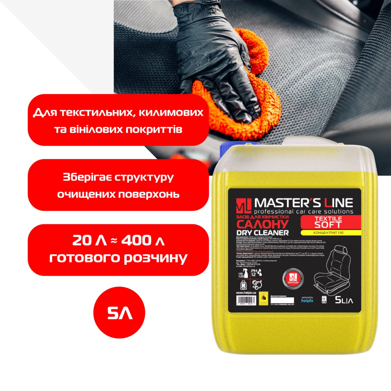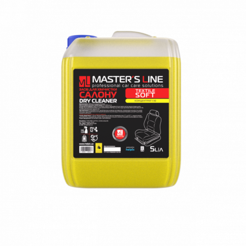 Засіб для хімчистки салону Master’s Line Textile cleaner Soft концентрат 1:10 – призначений для ефективного очищення та відновлення текстильних, килимових та вінілових покриттів. Може використовуватись як для хімчистки салону авто, так і в побуті для очистки м’яких меблів з текстильною оббивкою.